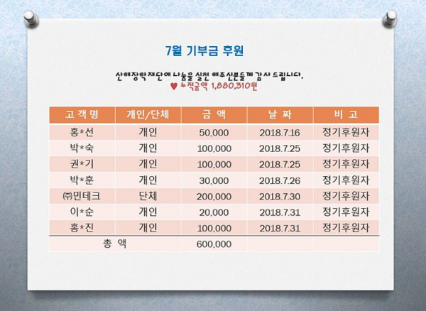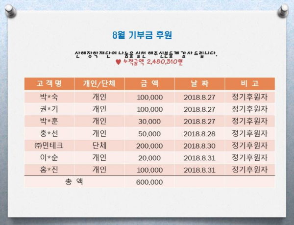 2018년 8월 기부금 모집현황 페이지 정보 작성자 최고관리자 작성일 25-10-21 14:24 조회 11회 본문 2018년 7,8월 재단 기부금 모집 현황작성자최고관리자 (115.40.53.37) 작성일 25-10-21 14:22 조회 1회2018년 8월 재단 기부금 모집 현황 이전글100만원으로 떠나는 100년의 역사 ---(모집 마감) 다음글산해장학재단 홈페이지 오픈 목록