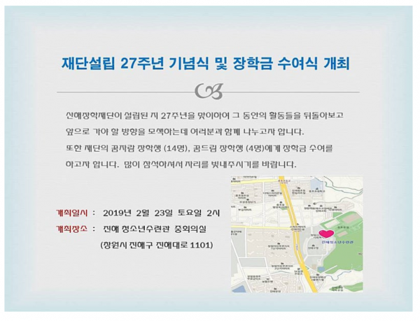 재단 설립 27주년 기념식및 장학금 수여식 개최 페이지 정보 작성자 최고관리자 작성일 25-10-21 14:34 조회 20회 본문 재단 설립 27주년 기념식및 장학금 수여식 개최 이전글100만원으로 떠나는 100년의 역사 탐방 발표회 다음글100만원으로 떠나는 100년의 역사 ---(모집 마감) 목록