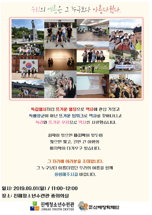 100만원으로 떠나는 100년의 역사 탐방 발표회 페이지 정보 작성자 최고관리자 작성일 25-10-21 14:36 조회 18회 본문 100만원으로 떠나는 100년의 역사 탐방 발표회 이전글2020년 장학금 전달식 잠정 연기 다음글재단 설립 27주년 기념식및 장학금 수여식 개최 목록