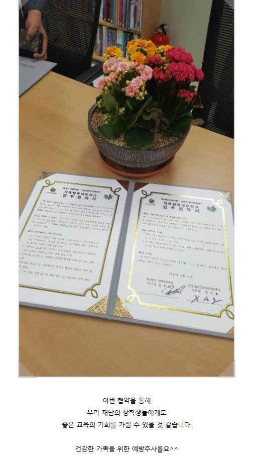 경남 건강 가정지원센터 협약식 페이지 정보 작성자 최고관리자 작성일 25-10-22 14:58 조회 2회 댓글 0건 본문 경남 건강 가정지원센터 협약식 이전글100만원으로 떠나는 100년의 역사 참가자 면접 현장 다음글재단설립 27주년 기념식 및 장학증서 수여식 2부 목록
