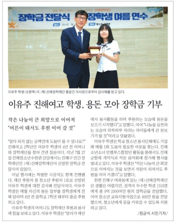 창원 시보 이유주 학생 , 용돈모아 장학금 기부 보도자료 페이지 정보 작성자 최고관리자 작성일 25-10-21 14:50 조회 4회 본문 창원 시보 이유주 학생 , 용돈모아 장학금 기부 보도자료 다음글창원시보 (재) 산해장학재단 인재 양성 훈훈 보도 목록